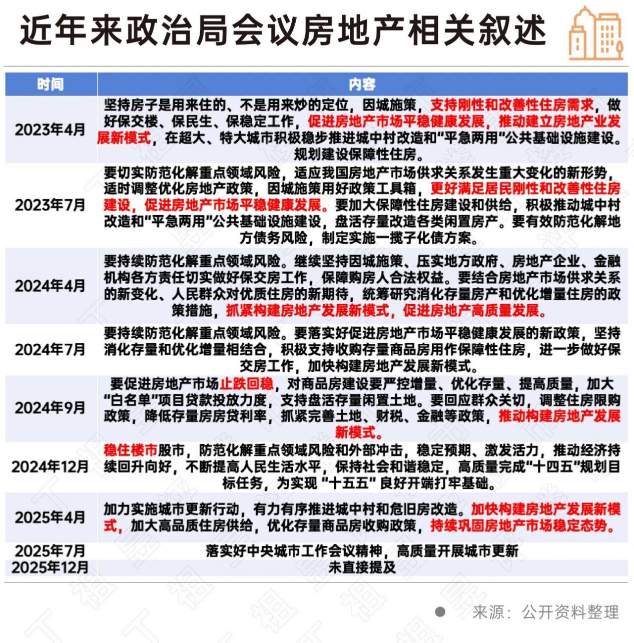 在此之前,2025年4月25日及7月30日的两次中央政治局会议对房地产市场的表述为:
