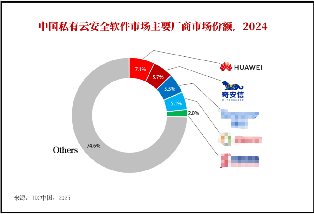 9月28日,国际权威研究机构IDC正式发布《中国私有云安全市场份额:2024》报告。报告显示,2024年中国私有云安全市场规模达到155.5亿元人民币,奇安信以5.1%的市场份额,在所有专业安全厂商中位居第一,总排名仅次于华为位列第二。而在2024年私有云安全软件细分市场中,奇安信优势更为明显,以5.7%的份额同样稳居专业安全厂商榜首,充分彰显其在私有云安全领域的整体核心竞争力。